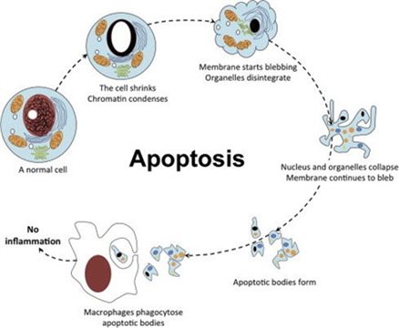凋亡的特征具有明顯的形態(tài)變化以及特定caspase和線粒體控制通路的激活。凋亡細(xì)胞出現(xiàn)細(xì)胞體積縮小,與周圍細(xì)胞脫離,然后細(xì)胞質(zhì)密度增加,通透性改變,染色質(zhì)濃縮和核碎裂,并顯示出稱為膜起泡的典型變形的膜,膜內(nèi)側(cè)磷酯酰絲氨酸外翻到膜表面,胞膜結(jié)構(gòu)仍然完整,無內(nèi)容物外溢,不引起周圍的炎癥反映。膜起泡可導(dǎo)致在垂死細(xì)胞邊緣形成小囊泡,稱為凋亡小體。凋亡小體可迅速被周圍的吞噬細(xì)胞吞噬。凋亡可以通過內(nèi)在或外在通路觸發(fā),內(nèi)在通路可以通過細(xì)胞應(yīng)激、DNA損傷、發(fā)育信號(hào)、存活因子缺失被激活,外在通路則是通過檢測(cè)到來自其他細(xì)胞的細(xì)胞外死亡信號(hào)來觸發(fā)的。