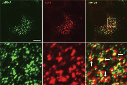 圖中展示了抗體J2(1:250稀釋, 4ug/ml)dsRNA (綠色標(biāo)注)和丙型肝炎病毒核心蛋白(紅色標(biāo)注)的標(biāo)記位點(diǎn),揭示了病毒組裝位點(diǎn)的位置(箭頭)。