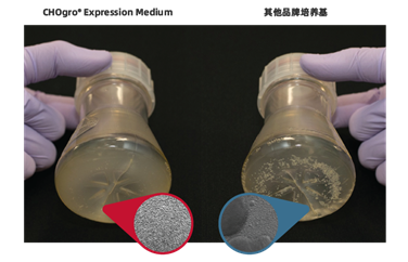 圖2. 使用Mirus CHOgro? High Yield Expression System中的CHOgro? Expression Medium進行培養(yǎng)(左),細胞結塊數(shù)量顯著少于其他培養(yǎng)基培養(yǎng)的CHO-S細胞(右)。
