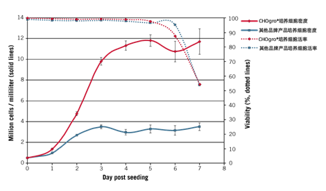 圖3. 使用CHOgro? Expression Medium培養(yǎng),CHO細胞密度更高,并且保持著較高細胞活性。