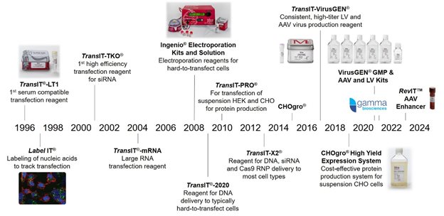 ? ? ? ?美國Mirus公司成立于1995年,是世界上很早開發(fā)高效、低毒轉染試劑的公司,同時也是該類試劑的主要供應商之一。其產(chǎn)品線涵蓋化學轉染試劑、電轉染產(chǎn)品、病毒生產(chǎn)和轉導產(chǎn)品,適用于基因功能研究、蛋白生產(chǎn)、病毒載體生產(chǎn)和動物模型構建等領域。Mirus被公認為轉染試劑開發(fā)的領跑者,其許多杰出成果獲得世界公認與廣大用戶的好評。