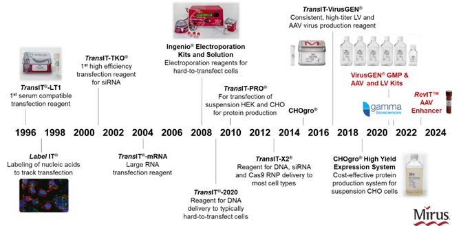 為什么Mirus TransIT-X2® Dynamic Delivery System有著如此高性能及廣泛適應(yīng)性呢?這歸因于Mirus強大且高效的專利遞轉(zhuǎn)平臺設(shè)計,可進(jìn)行多重、多功能組合的轉(zhuǎn)染試劑組分篩選并優(yōu)化。成立于1995年的Mirus,專注及深耕核酸遞轉(zhuǎn)領(lǐng)域多年(圖1),從最早具有低毒性的TransIT ® -LT1到GMP級別、可用于AAV和LV生產(chǎn)的TransIT-VirusGEN®,都是基于該遞轉(zhuǎn)平臺進(jìn)行設(shè)計及開發(fā)的。截至目前,使用Mirus產(chǎn)品發(fā)表文章已超過1萬篇,并且發(fā)表文章及Mirus數(shù)據(jù)庫涵蓋了超過1200種細(xì)胞類型,更多文章及數(shù)據(jù)查詢,請點擊這里。