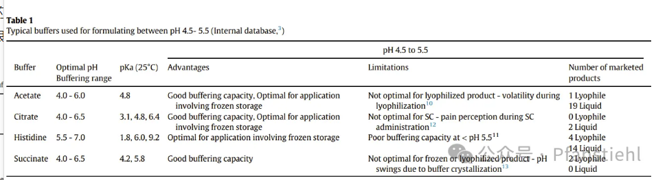 盡管在液體和凍干產(chǎn)品中,組氨酸在pH 5.5至6.5的范圍內(nèi)都占據(jù)主導地位,但如果目標pH值在4.5至5.5之間,我們依然還有另外三種緩沖液可選,即醋酸鹽、檸檬酸鹽和琥珀酸鹽。這些緩沖物質(zhì)存在某些固有的挑戰(zhàn),阻礙了它們在靜脈和皮下給藥以及液體和凍干劑型方面的廣泛使用。而組氨酸的pKa值為6,在pH<5.5時緩沖性較差,因此在4.5至5.5的pH范圍內(nèi)應(yīng)用有限。雖然醋酸鹽在此范圍內(nèi)具有良好的緩沖能力,但其易揮發(fā)和冷凍干燥過程中溶劑的過度損失是其應(yīng)用相關(guān)的潛在挑戰(zhàn)。檸檬酸鹽緩沖制劑在皮下應(yīng)用中使用有限,原因是在皮下注射期間存在壞死的風險。琥珀酸鹽在pH4.5至5.5之間提供了強大的緩沖能力,但由于琥珀酸鹽結(jié)晶影響產(chǎn)品穩(wěn)定性而導致pH值劇烈波動的風險,通常避免其用于冷凍或凍干的應(yīng)用。以下表格總結(jié)了在注射制劑中使用這四種緩沖液的局限性[1]。