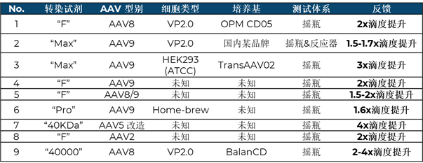 Mirus Bio成立于1996年,在核酸遞送領(lǐng)域深耕多年,于2021年8月推出GMP級(jí)別TransIT-VirusGEN® GMP 轉(zhuǎn)染試劑,支持AAV及LV從科研到GMP商業(yè)化生產(chǎn)。不同于傳統(tǒng)基于單組分的轉(zhuǎn)染試劑(如陽(yáng)離子聚合物聚乙烯亞胺,PEI),Mirus Bio將專利的多聚物及脂質(zhì)技術(shù)進(jìn)行多重組合,形成多功能性的轉(zhuǎn)染方案,克服細(xì)胞遞轉(zhuǎn)過程中的多重阻礙,以實(shí)現(xiàn)更高效轉(zhuǎn)染和更低細(xì)胞毒性,從而大幅度提升多種血清型AAV病毒生產(chǎn)載量。去年7月底Mirus上市RevIT? AAV Enhancer,已證明在不同AAV血清型別中,可提高AAV病毒基因組滴度1.2-4.9倍,并且在一定程度改善了實(shí)心率。更重要的是,RevIT? AAV Enhancer不僅可以搭配Mirus TransIT-VirusGEN® GMP 轉(zhuǎn)染試劑,也適配于其他轉(zhuǎn)染試(如PEI等),使得AAV生產(chǎn)上游成本的進(jìn)一步降低成為可能,進(jìn)而降低了基因治療單劑量成本。下圖展示了國(guó)內(nèi)客戶前期測(cè)試反饋結(jié)果,測(cè)試包括了不同血清型別的質(zhì)粒設(shè)計(jì),適用于國(guó)內(nèi)及國(guó)外品牌的轉(zhuǎn)染試劑、細(xì)胞及培養(yǎng)基體系,實(shí)現(xiàn)了1.5-4倍以上的AAV病毒滴度提升。