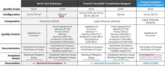 - 產(chǎn)品組分:TransIT®-AAViator轉(zhuǎn)染試劑及RevIT? AAV增強(qiáng)子