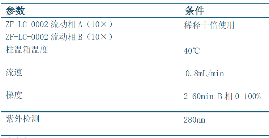 下表列出了使用ZF-LC-0002流動相A&B(10×)進行IEC-HPLC液相分析的色譜參數(shù):