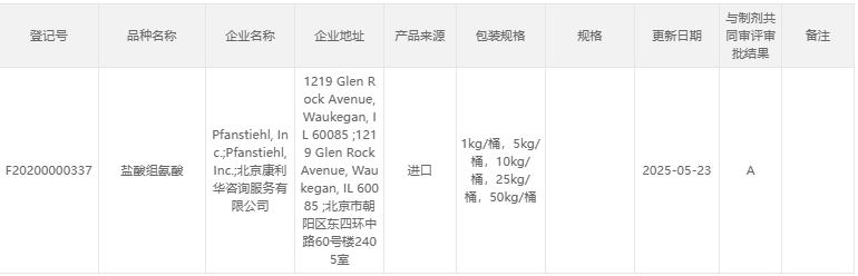 “ 熱烈祝賀Pfanstiehl品牌注射級(jí)鹽酸組氨酸H-117 CDE注冊(cè)登記號(hào)F20200000337已激活!”