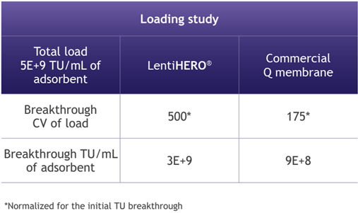 Load volume 20 mL to a screening device measured on average 3E+8 IU/mL adsorbent.